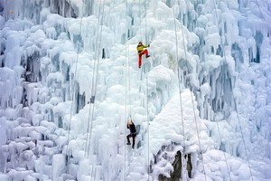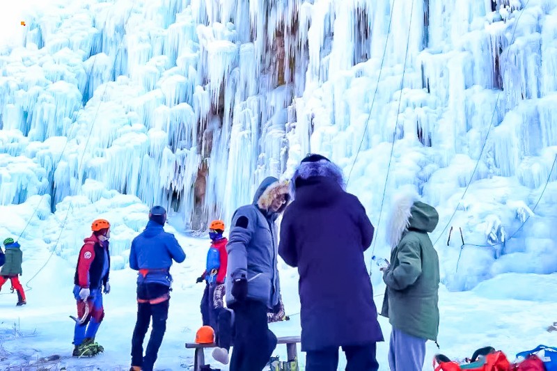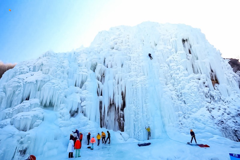 大自然的鬼斧神工造就了70米高的冰壁,雪白的冰壁之上,正是攀冰者们的绝妙“芭蕾场”。敏捷而果断的出脚,将冰镐牢牢扎入冰面,一步一步慢慢登顶,如此美妙的“冰瀑芭蕾”,每日在玉渡山攀冰基地不断地上演。
