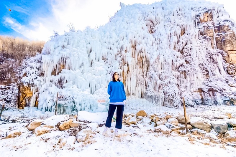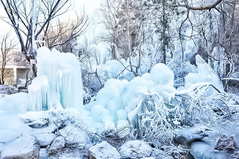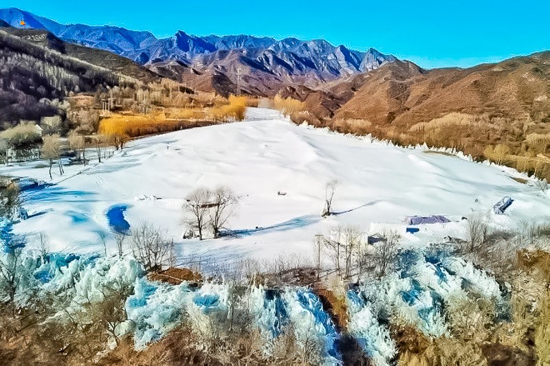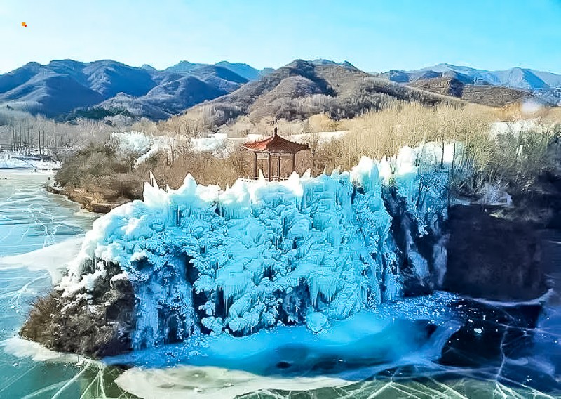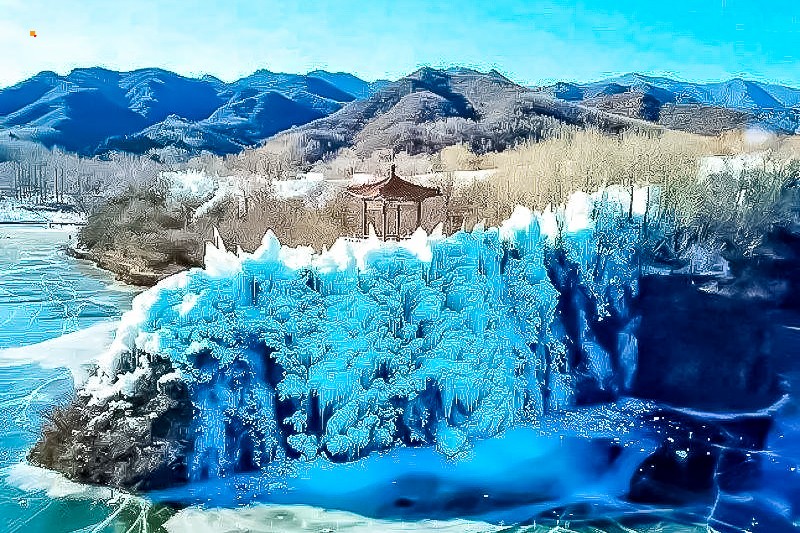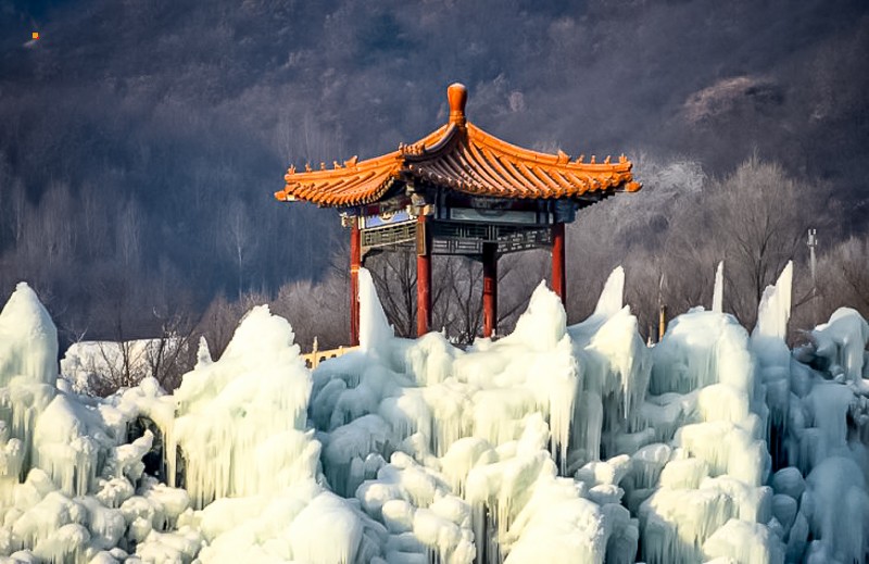 玉渡山风景区位于燕山第一高峰海陀山脚,每年拥有4个月的冰雪期,堪称北京自然冰雪资源最丰富的场地。零下十多度的最低气温,使景区里呈现出清流与冰瀑交相辉映的奇景。