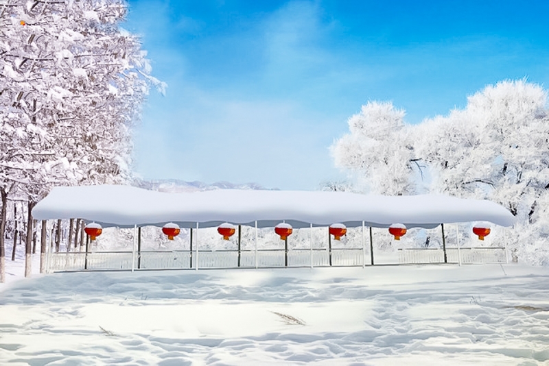 山下6000平方米的林地被打造成茫茫的林海雪原,忘忧湖亲水平台道路两侧打造了约4000平方米的观赏区,600平方米的空地上还建起了雪屋,两侧林地挂满冰晶的树枝在阳光的反射下褶褶生辉,呈现出一个梦幻般的水晶世界。